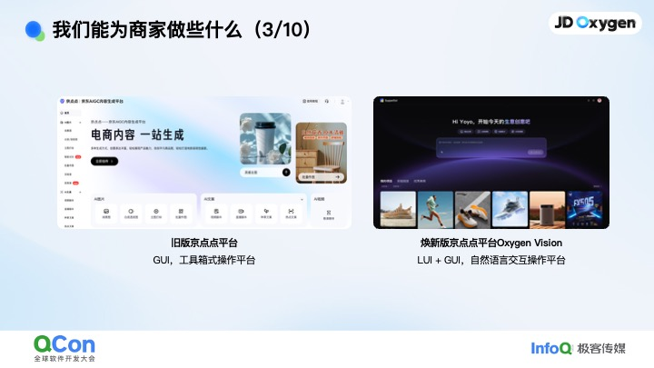 那么今天我们借 QCon 这个场合,也向大家正式发布我们焕新版的京点点平台,它也是整个 Oxygen 大模型家族中的一员,叫做 OxygenVision,这次升级我们从原来的工具箱式的 Graphical UI 升级到最新的 Linguistic UI + Graphical UI 的方式,实现了人与机器完全基于自然语言的交互形式。