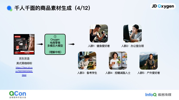 接下来,我用一个案例给大家做一下演示,这是一款京东京造的美式黑咖啡,我们将商品的全部 Meta 信息都输送给大模型,再配合上合适的系统指令,电商零售多模态大模型是可以给出这款商品可能适合的几个人群类型的,比如“健身爱好者”、“办公室白领”、“备考学生”、“控糖减脂人士”以及“户外爱好者”,这个地方起作用的除了商品本身的信息外,还有来自理解模型的世界知识,共同推导出了这几类潜在的消费对象。