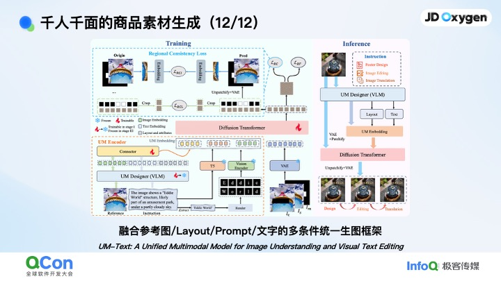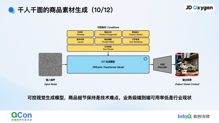 第二个我们要详细介绍的模型是可控视觉生成模型,这是一个基于多条件的扩散模型,上面黄色部分都是模型的可控条件,这里除了扩散模型所必须的 Timestep 和文本 Prompt 外,商品主体、文字、布局 Layout、贴片都是可以作为可控条件输入的,不过之所以是大家现在看到的框架,本质原因还是生成模型的文本指令跟随能力较弱,未来我们会看到不同类型的可控条件都可以统一到一个自然语言描述的文本空间,同时理解模型也会和生成模型实现架构上的紧耦合。但是,站在业务的角度来看,电商领域的可控生成是所有领域中要求最高的,也是最严肃的场景,任何商品信息的改变都会引发非常严重的业务后果,所以到目前为止业务级端到端的素材生成可用率也是比较低的,这是行业现状。