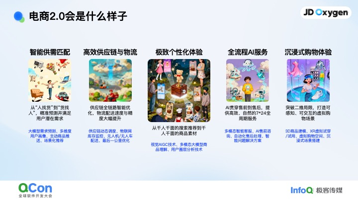 首先是更加智能的供需匹配,从过去的“人找货”进化到“货找人”,借助大模型的世界知识结合用户行为与多维度画像,配合场景化的推荐,实现精准的用户需求匹配;其次是高效的供应链与物流体系,这里会有供应链的动态调度,会有无人车 / 无人机去实现最后一公里的效率优化;接着是全流程的 AI 服务,这个会贯穿售前到售后,借助多模态大模型达到 7*24 小时的全周期服务;当然体验上电商 2.0 时代也会突破原有的二维局限,打造可感知、可交互的沉浸式虚拟购物体验。最后,也是我今天要重点和大家分享的是,极致的个性化体验,即从“千人千面”的搜索推荐到“千人千面”的商品素材,这里涉及到多模态理解模型与 AIGC 视觉生成模型,接下来我会详细的给大家分享。