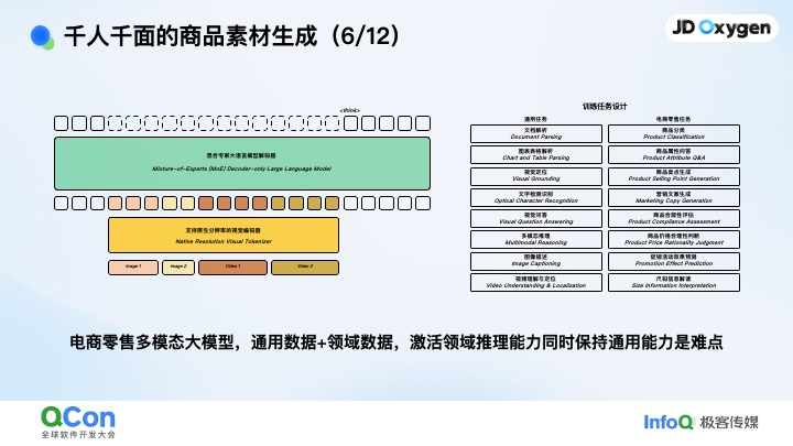 首先是电商零售多模态理解大模型,这个模型是一个经典的 Vision Language Model 的技术框架,可以看到不同的模态会通过专用的 Tokenizer 进行 Token 化,然后输入至一个 MoE 架构的 Decoder-only Large Language Model,这里面关键的技术难点不在于模型结构,而是如何在激活电商零售这个垂域推理能力的同时保持住原始模型的通用能力,所以右侧我们给大家分享了针对通用场景以及电商零售场景我们分别应该如何去设计训练任务以及如何收集训练数据。
