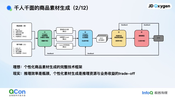 这张图展示了“千人千面”商品素材生成的技术链路,我从左到右给大家做解释,输入侧我们需要商品的信息以及用户的信息,其实就是“货”的信息与“人”的信息,“货”这边我们能用到的信息包括商品的主图 / 商详图,评论区 / 问大家,参数规格等一系列商品 Meta 信息,当然这里面也可以引入一些关于商品的外部知识,通过 RAG 的方式接入模型;“人”这边我们能利用用户的历史行为以及用户画像,当然相关外部知识依然是受欢迎的。接着,我们将“人”与“货”的完备信息输入至电商零售领域的专有多模态大模型,模型会给出该商品呈现给该用户最合适的一些素材生成指令集,包括营销卖点、主图场景描述以及 Layout 布局设定,随后可控视觉生成模型会依据生成指令去生成符合要求的多套素材。然而这些生成的素材并不会直接投放到线上参与流量分发,而是会从效率角度先过一个质量预估模型,将明显不符合预期的素材进行前置淘汰,然后通过搜推系统进行流量分发。所以至此,我们介绍了链路中 1234 四个重要模型,他们分别承担着理解中枢、生成中枢、效率中枢以及分发中枢的角色。到这里链条还没有结束,因为分发到线上的素材会获得实际的用户反馈,而这些反馈可以帮助前面四个关键模型进行效果迭代,这是非常重要的。好了,我们总说“理想是丰满的,但现实却是骨感的”,之所以这样讲是因为这套技术框架其实是一种纯理想态,其中用户和商品的组合数是一个天文数字,而且无论是理解侧模型还是生成侧模型都无法做到实时的推理响应,所以整套技术框架在当前是无法支持在线推理的,更多的是近线甚至离线。所以我们说,个性化的素材生成其实是推理资源或推理效率与业务收益的一种 trade-off。