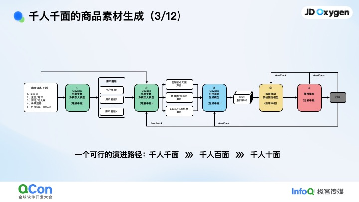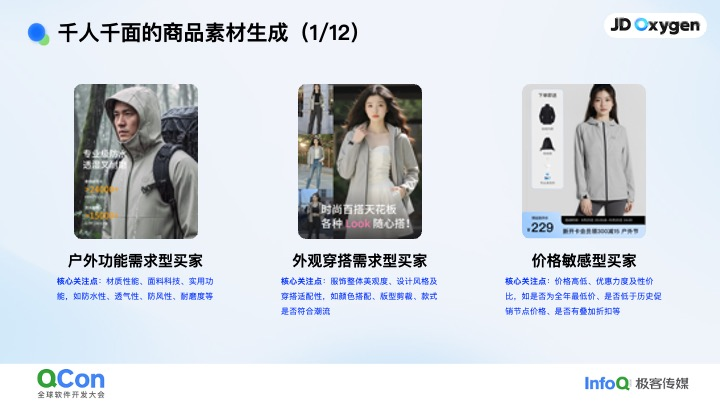 “千人千面”的搜索推荐,在这个时代大家肯定不陌生了,但是真正意义下“千人千面”的商品素材,其实作为消费者大家体感并不强烈,这也是整个电商行业和京东正在努力突破的技术产品方向之一。这个例子就非常典型,同样的一件冲锋衣,不同类型的买家关注点完全不一样。比如最左边的“户外功能需求型买家”,Ta 所关注的是功能型指标,例如防风性、防水性、面料科技等等,中间的“颜控型买家”,Ta 更多的则是关注服装本身的美观度、设计风格、以及与其他服装的搭配效果,所以商卡会呈现出较多 OOTD 相关的内容,也是一类非常典型的买家;最右边的买家同样典型,是“价格敏感型”,会关注促销活动、赠品、价格是否为全网最低价,所以商卡的呈现一直在 highlight 优惠相关的信息。通过解释这三个 case,大家应该也清楚了什么叫“千人千面”的商品素材。接下来,我就和大家分享如何从技术上去实现这一套业务框架。
