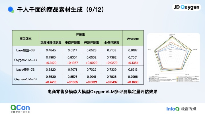 这是我们提出的 OxygenVLM 的定量评测,评测集包括用于通用任务的开源评测集,也包括零售行业的业务评测集、电商评测集以及电商深度推理评测集,我们的目标是希望 OxygenVLM 相比基础通用 VLM 在开源评测集不损失性能,同时在零售行业评测集有较大优势。