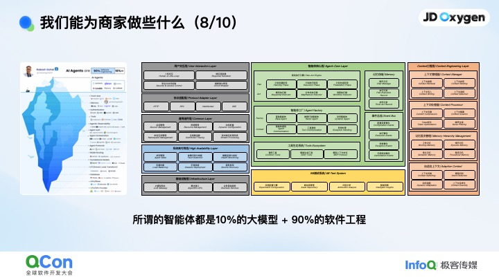 看完视频大家肯定都想了解下背后的技术实现,我这里用两页幻灯片给大家做一下分享。首先,毫无疑问,这是一个复杂的多智能体协同系统,提到智能体,现在应该还有一部分同学会觉得智能体就是一个 SOTA 的大模型加上一段 System Prompt 就能实现,其实真实的工业级应用智能体研发更像是冰山模型。左边这张图是我想要和大家分享的,一个完整的智能体系统只有 10% 的大模型,剩下水面下的 90% 都是软件工程。右边这张图是焕新版京点点平台的智能体技术模块框架图,这 90% 的工作量包含哪些呢,包含系统的高可用层(这里涉及到复杂的智能体状态管理、负载均衡、故障恢复以及健康监测等)、 包含记忆存储、包含事件总线、包含上下文的处理器、管理器等等。这张图文字太小,当然不是为了让大家一定都能看清楚的,主要是为了能让大家感受到一个智能体系统提示词之外的工作量在哪里。