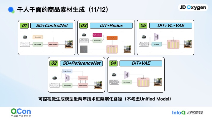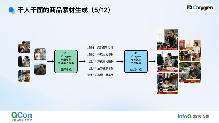 有了这些目标人群,接下来再次通过电商零售多模态大模型去生成不同人群所对应的商品素材场景,然后通过可控视觉生成模型去完成完整的商品素材生成。最后大家看到的这些素材就是可以直接参与个性化投放的商品物料了。同时,大家可以看到,在这页幻灯片里,或者说在整个技术链条中,有两个基础模型非常关键,一个是圈 1 的电商零售多模态大模型,也就是我们的理解中枢,一个是圈 2 的可控视觉生成模型,即我们的生成中枢,接下来我将为大家介绍这两个模型的技术实现框架。