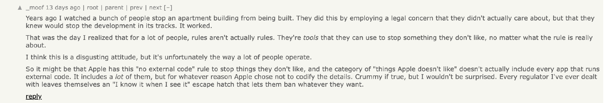 套用到这件事上,苹果之所以制定“禁止运行外部代码”的规则,可能只是为了封杀那些他们看不顺眼的东西。而所谓“苹果看不顺眼的东西”,其实并不涵盖所有运行外部代码的应用。虽然被杀掉的应用很多,但由于某种原因,苹果拒绝把这些细节写进明文规定里。如果事实真是如此,那确实很差劲,但我一点也不觉得意外。因为我接触过的每一个监管者,都会给自己留一个“我看一眼就能定罪”的逃生舱,好让他们能随心所欲地查禁任何东西。
