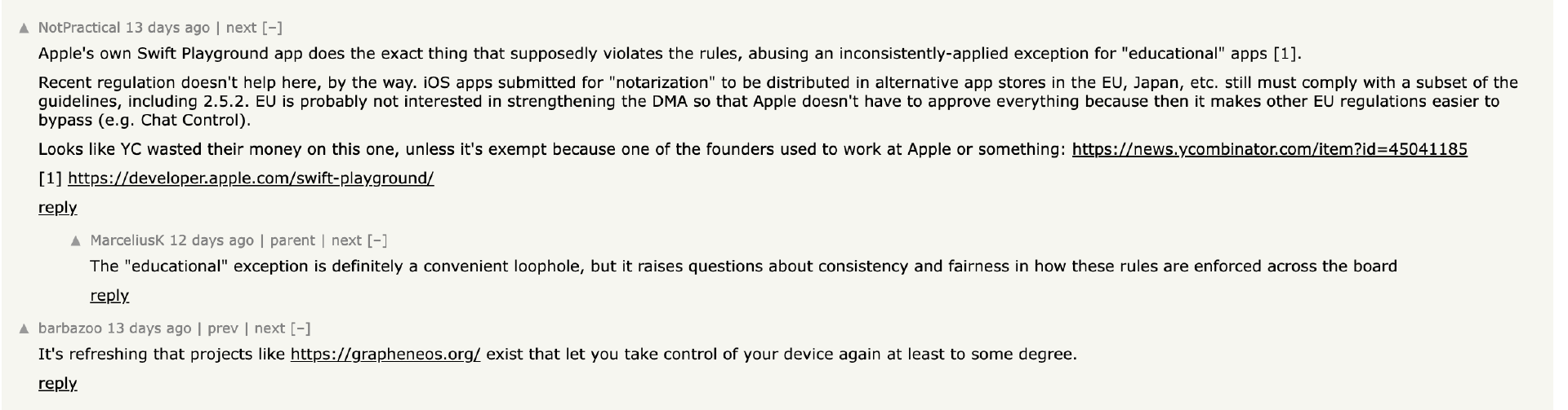 一位用户直接引用了相关规定,指出苹果明确要求应用“不得下载、安装或执行会改变应用功能的代码”,仅对教育类应用设有有限例外。这也成为不少人理解此次事件的出发点——即 Vibe Coding 类应用本质上允许用户生成并运行代码,因此天然处在规则的灰色地带。有评论认为,从这个角度看,这类应用被限制“并不令人意外”,因为“允许在应用内运行自定义代码,一直是被禁止的”。