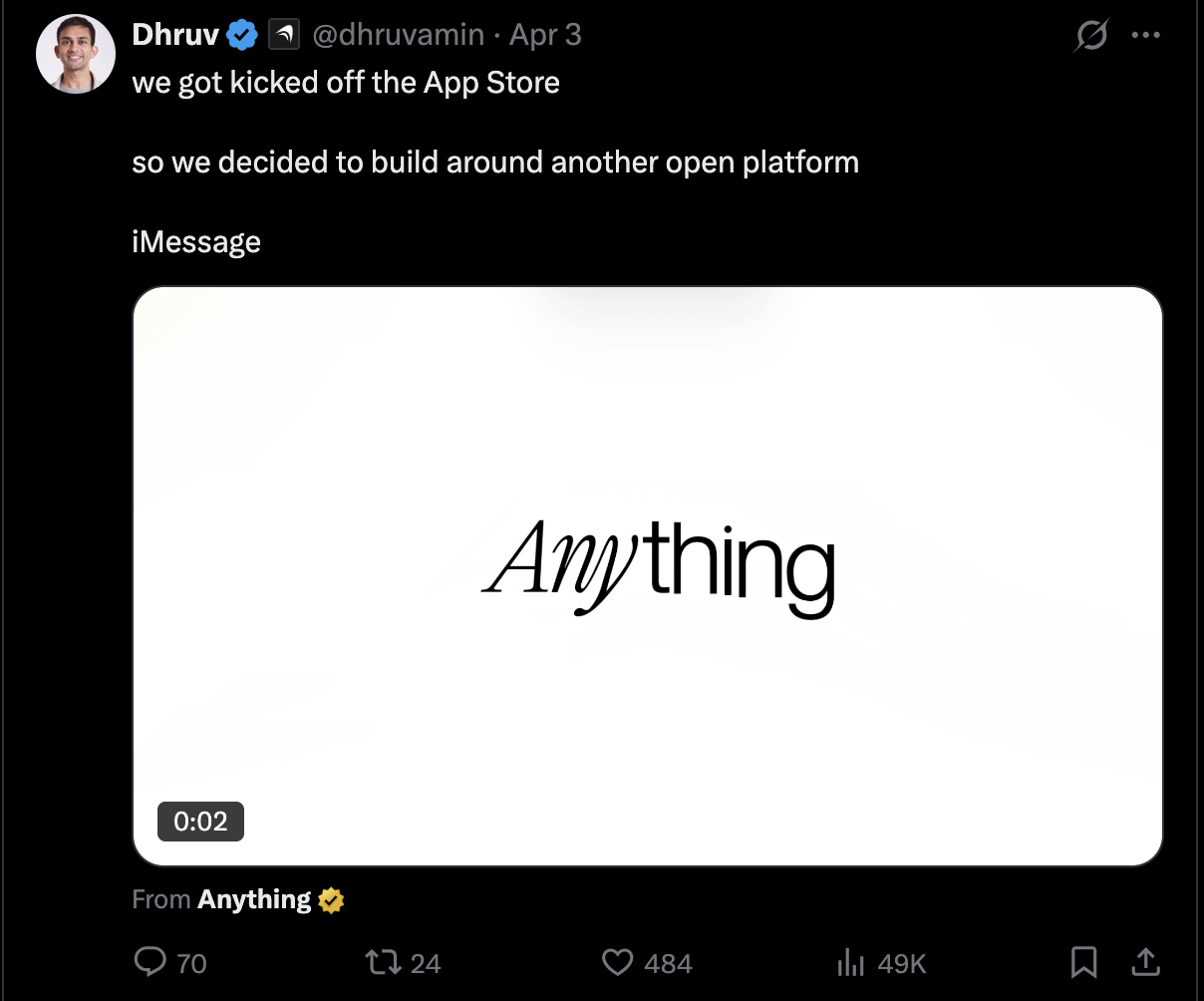 Anything 的联合创始人 Dhruv Amin 在接受媒体采访时表示,苹果公司于 3 月 26 日下架了他们的应用程序。此后,尽管曾短暂恢复上架,但该公司一直未能获得重新批准。