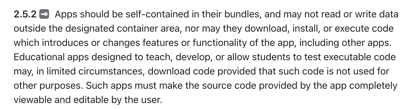 这条规则历来会阻止脚本环境、插件系统以及绕过 App Store 的更新机制。