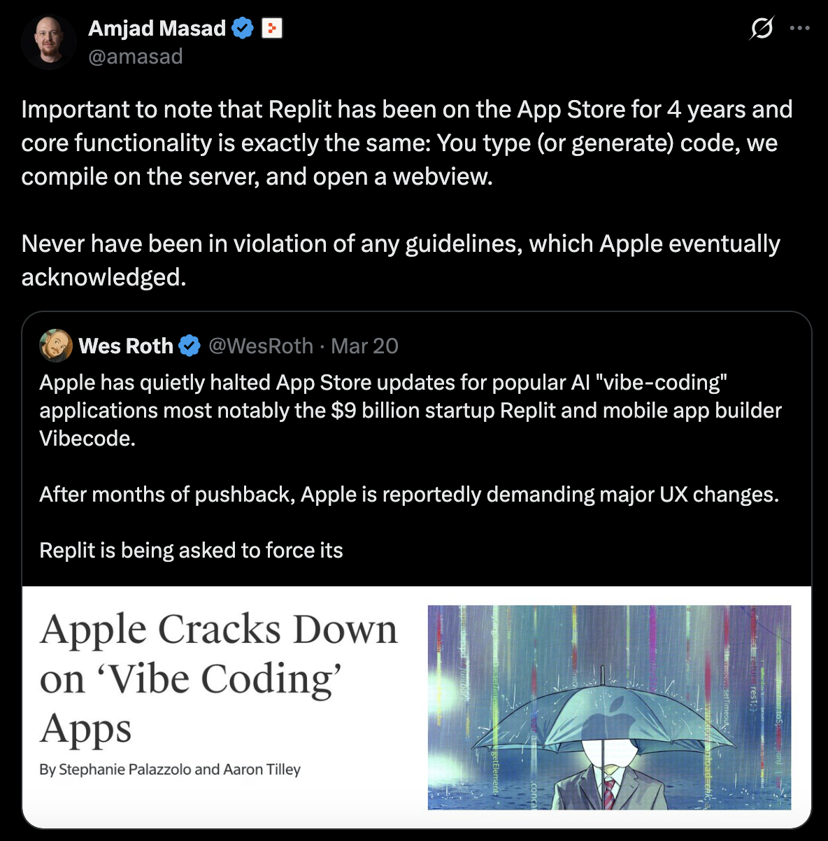 这迟早会发生。如果人们可以编写自己的应用程序,只需一个提示就能运行,那么整个应用商店市场将会崩溃。苹果的策略与 AI 编程的理念完全背道而驰。