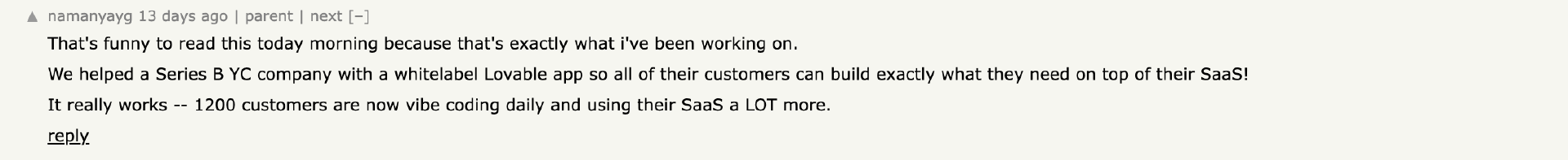 围绕这一趋势,也有开发者分享了实践案例。有评论提到,他们正在为一家完成 B 轮融资的公司构建“白标”Vibe Coding 能力,使其 SaaS 平台的客户可以直接生成所需功能。据称,这一模式已吸引约 1200 名用户每日使用,并显著提升了产品活跃度。这类案例被视为 Vibe Coding 潜在商业价值的直接证明,也强化了“需求已经存在,平台限制难以阻挡”的判断。