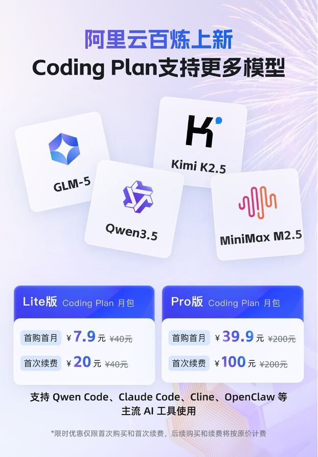 值得注意的是,在目前国内云厂商中,阿里云是首家在 Coding Plan 中包含自家模型之外,还集齐智谱、Kimi、MiniMax 这些国产开源模型最新、最强版本(GLM-5、MiniMax M2.5、Kimi K2.5)的服务商。