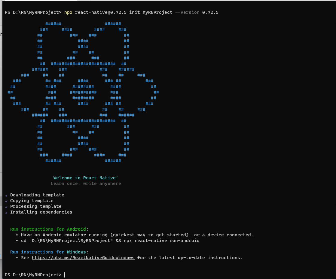 这个命令行工具不需要安装,可以直接用 node 自带的 npx 命令来创建,目前 ReactNative for OpenHarmony 仅支持 0.72.5 版本的 ReactNative。