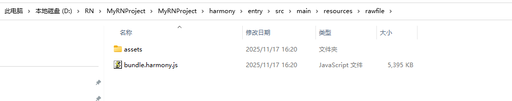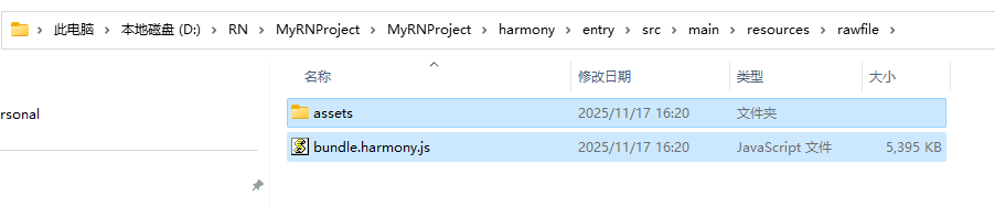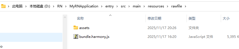 运行成功后,会在 AwesomeProject/harmony/entry/src/main/resources/rawfile 目录下生成 bundle.harmony.js 和 assets 文件夹,assets 用来存放图片(如果 bundle 中不涉及本地图片,则没有 assets 文件夹):