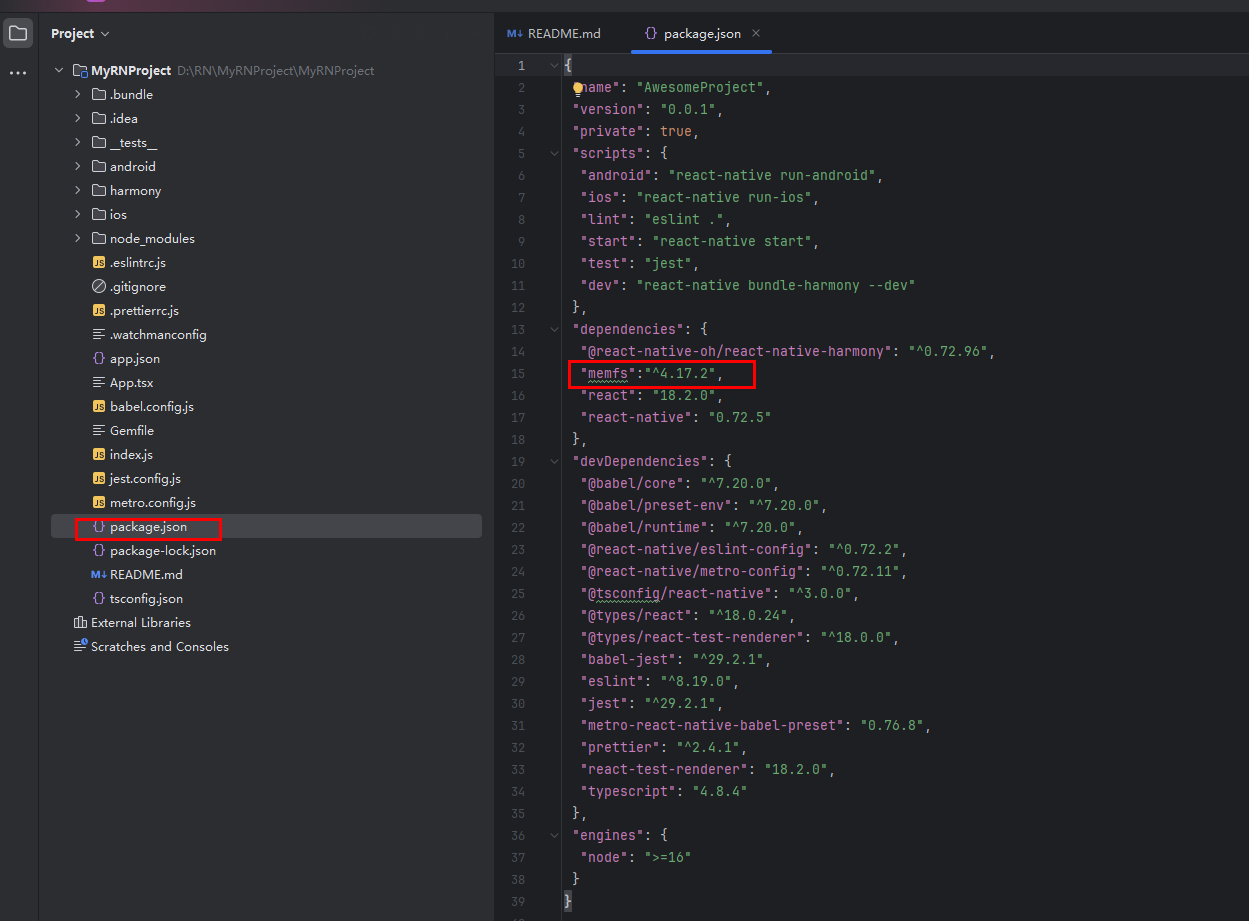 { "name": "AwesomeProject", "version": "0.0.1", "private": true, "scripts": { "android": "react-native run-android", "ios": "react-native run-ios", "lint": "eslint .", "start": "react-native start", "test": "jest", "dev": "react-native bundle-harmony --dev" }, "dependencies": { "react": "18.2.0", "react-native": "0.72.5" }, "devDependencies": { "@babel/core": "^7.20.0", "@babel/preset-env": "^7.20.0", "@babel/runtime": "^7.20.0", "@react-native/eslint-config": "^0.72.2", "@react-native/metro-config": "^0.72.11", "@tsconfig/react-native": "^3.0.0", "@types/react": "^18.0.24", "@types/react-test-renderer": "^18.0.0", "babel-jest": "^29.2.1", "eslint": "^8.19.0", "jest": "^29.2.1", "metro-react-native-babel-preset": "0.76.8", "prettier": "^2.4.1", "react-test-renderer": "18.2.0", "typescript": "4.8.4" }, "engines": { "node": ">=16" }}3.安装鸿蒙依赖包