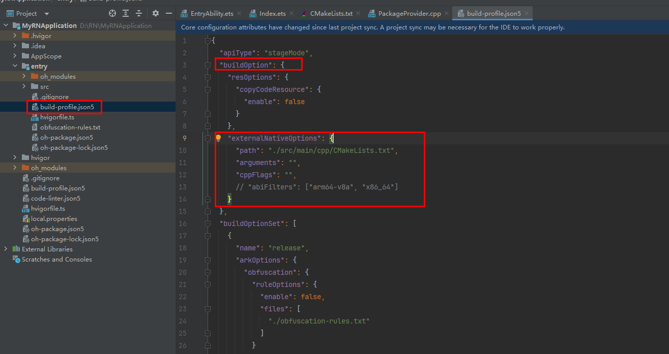 #include "RNOH/PackageProvider.h"using namespace rnoh;std::vector<std::shared_ptr<Package>> PackageProvider::getPackages(Package::Context ctx) { return {};}3.打开 MyRNApplication\entry\build-profile.json5,将 cpp 中的代码添加到应用工程的编译构建任务中。
