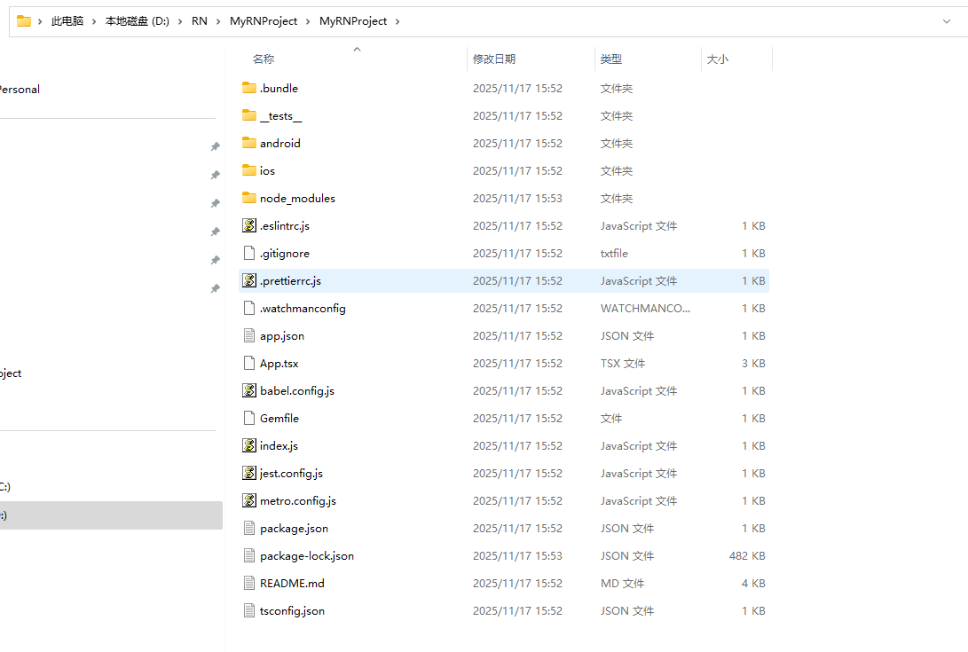 运行成功后会在 D:\RN 目录下创建 MyRNProject 文件夹,文件夹目录结构如下: