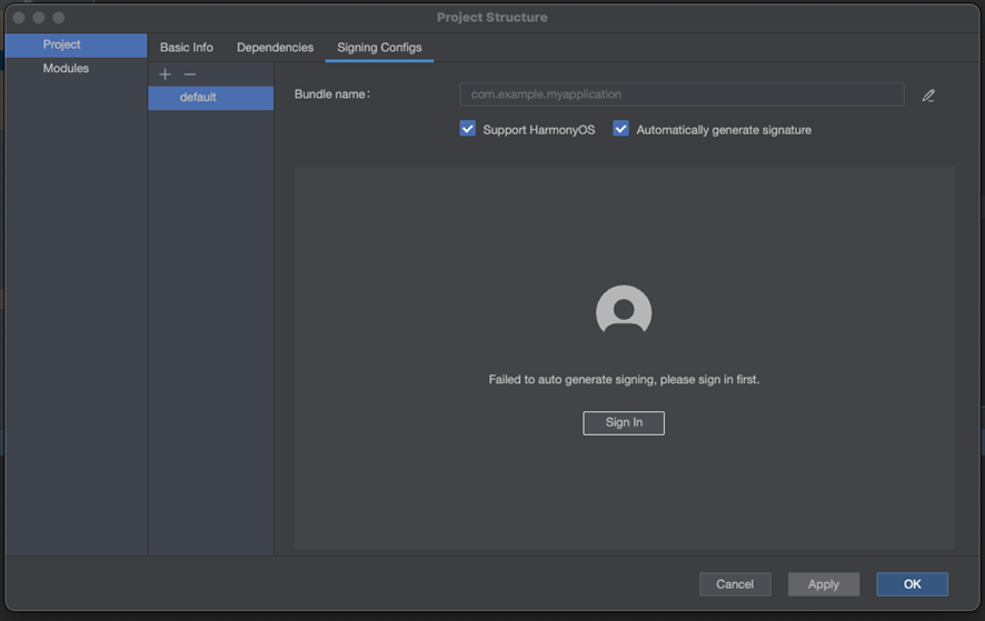 连接真机,点击 File > Project Structure,在弹窗界面点击 Signing Configs,勾选 Support HarmonyOS 和 Automatically generate signature,然后点击 Sign In 登录华为账号,并签名。