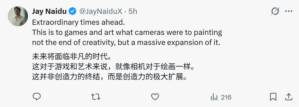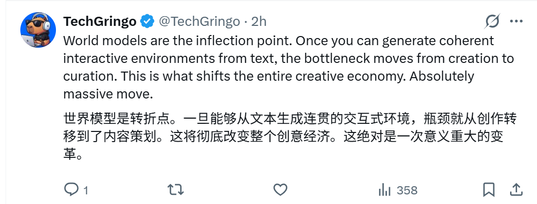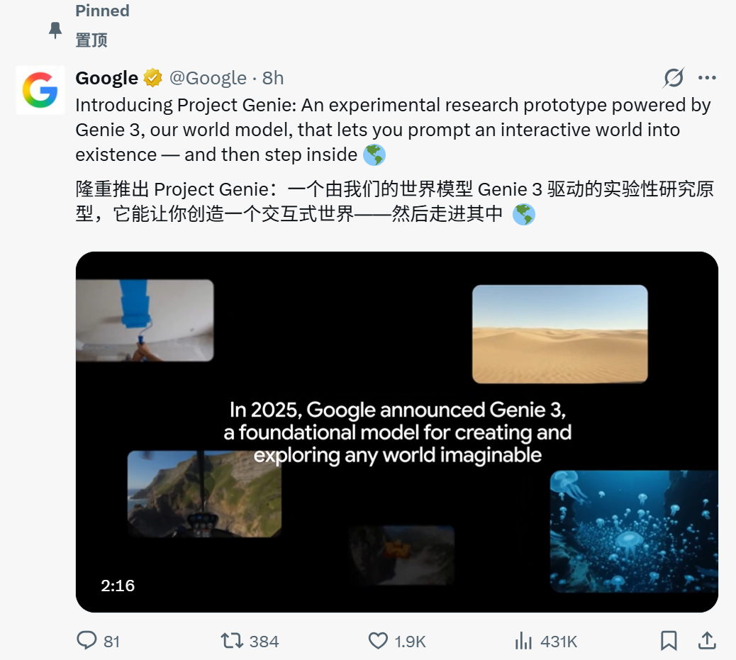 关于 Project Genie 的讨论,也在 X 上迅速扩散,不少网友将其称为又一个“变革时刻”。