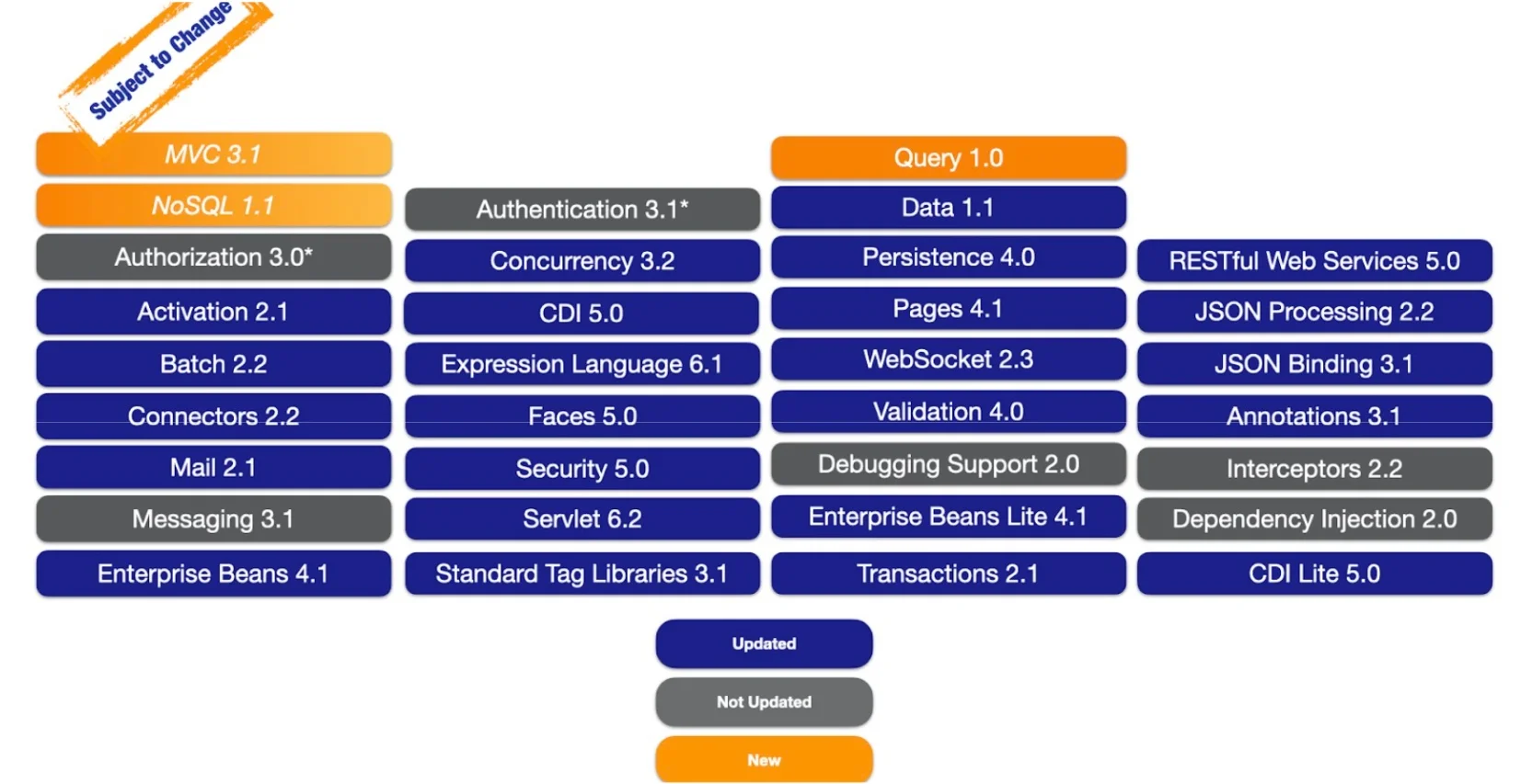 在深入探讨 Jakarta EE 12 Milestone 2 的新内容之前,简要解释开发阶段,包括测试、社区反馈和两个修订里程碑是很重要的。与任何软件开发过程中的典型情况一样,这些规范在最终投票(在这种情况下,由 Jakarta EE 指导委员会对过程进行投票)之前可能会发生变化或延迟。如图 1 所示,这是目前作为 Jakarta EE 12 平台一部分的规范集: