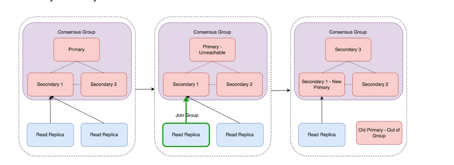 以前,Uber 的 MySQL 集群采用的是单主异步复制模型。外部系统检测到故障时会提升副本,故障转移时间以分钟计。为了减少停机时间并提高可靠性,Uber 采用了MySQL Group Replication,这是一种基于 Paxos 的共识协议。新架构将共识机制嵌入到数据库中,形成了一个三节点 MGR 集群。一个节点作为主节点用于写入,而另外两个辅助节点参与共识表决而不直接接受写入。这可以确保所有节点都有最新的数据,并在需要时自动选举新的主节点。