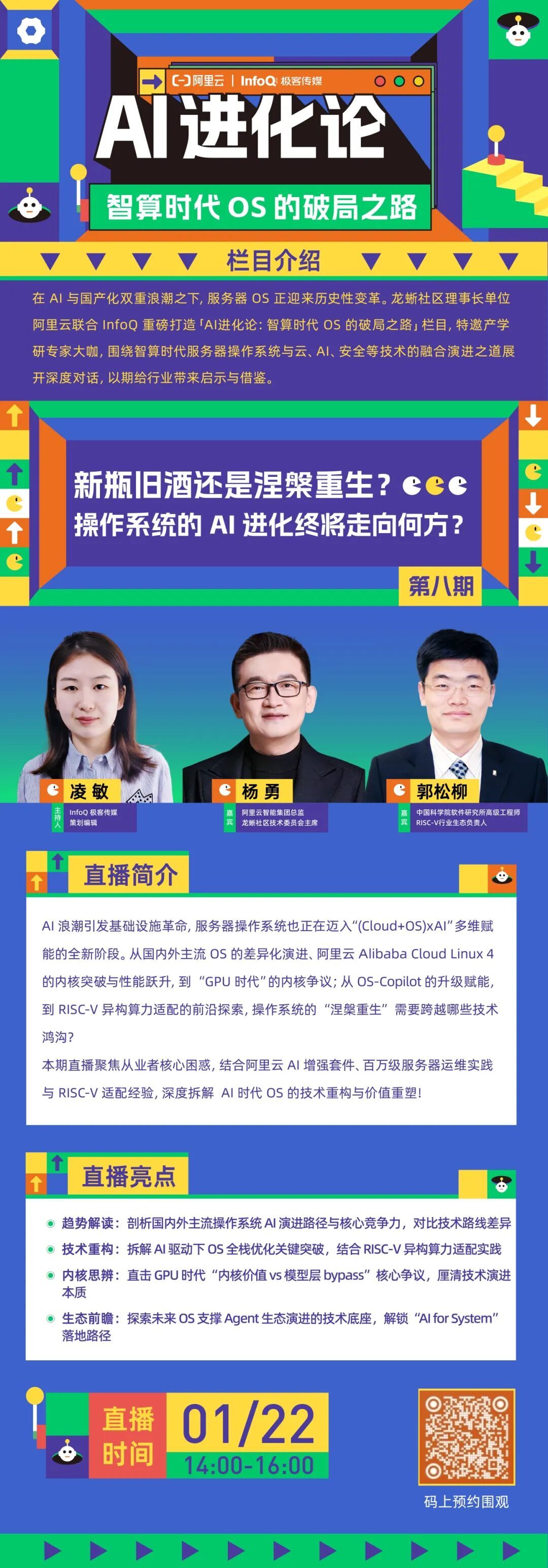 《AI 进化论:智算时代操作系统的破局之路》系列直播第八期将于 1 月 22 日 14:00 开始,特别邀请到,阿里云智能集团总监、龙蜥技术委员会主席杨勇,中国科学院软件研究所高级工程师、RISC-V 行业生态负责人郭松柳,InfoQ 极客传媒策划编辑凌敏三位嘉宾,聚焦从业者核心困惑,结合龙蜥社区理事长单位阿里云 AI 增强套件、百万级服务器运维实践与 RISC-V 适配经验,深度拆解 AI 时代操系统的技术重构与价值重塑!