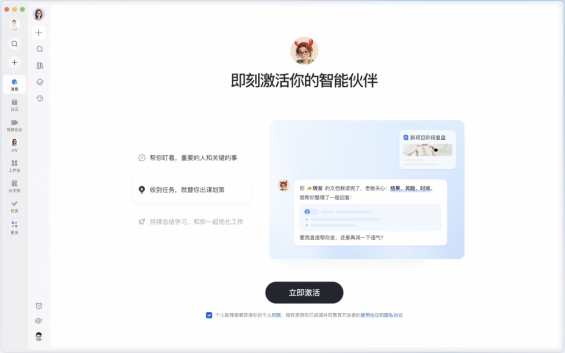 飞书 aily 的智能伙伴不仅内置飞书内的办公技能,还支持零门槛创建与更新各类安全可靠的业务技能,能在真实工作中沉淀记忆,自动学习优化。在权限体系上,飞书 aily 与用户本人严格一致,确保了操作可控与数据安全。此外,飞书 aily 专业版能以独立 Web 端形式支撑更复杂的操作与信息呈现。