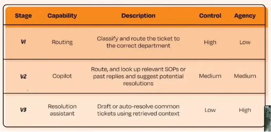 当你建立起足够信心后,才可以让 AI 直接向用户展示答案。接着,再逐步增加复杂能力,例如自动退款、创建功能请求等。如果在第一天就把这些能力全部交给 Agent,系统复杂度会迅速失控。因此,我们始终建议按阶段构建,逐步提升自治水平。