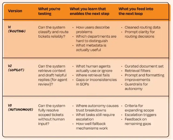 一开始,并不是把所有支持中心文章一股脑塞进 Agent 就完事了。更合理的第一步,是让 AI 为人工客服提供建议,由人类判断哪些建议是有用的、哪些是无效的。通过这个反馈回路,你可以识别系统的盲点并进行修正。