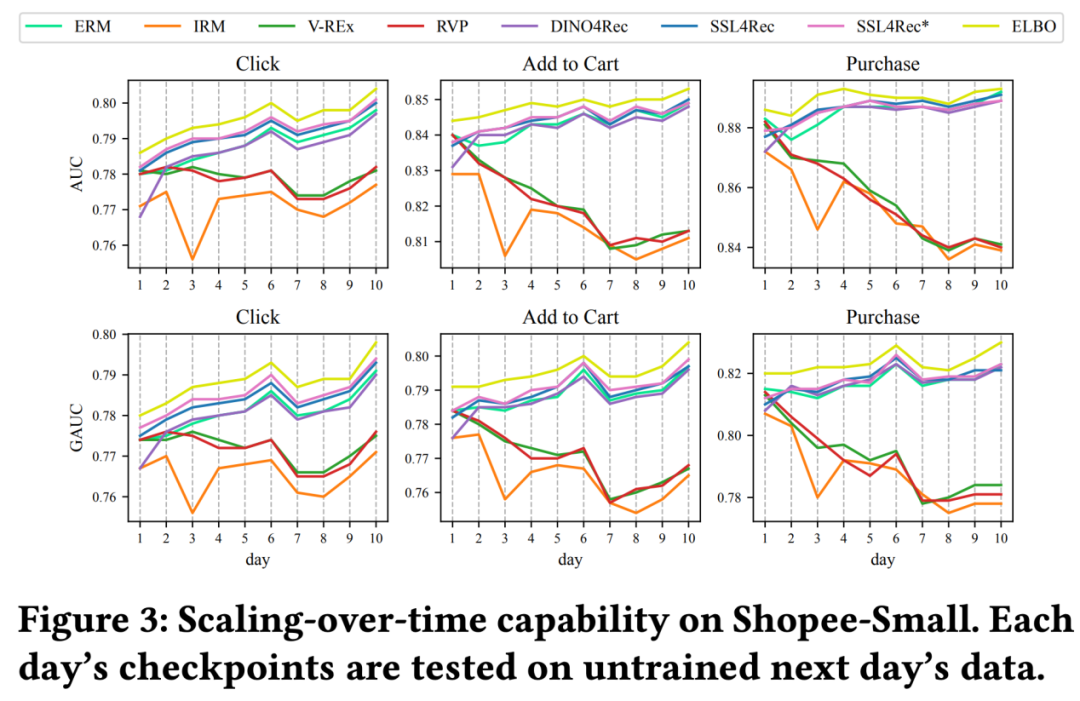 这是因为 IRM 类方法假设数据集的不同 partition 之间存在绝对不变的“内核”,试图用某种 regularization + 对其它 partition 数据的重复访问,来学到这个“绝对不变”的隐变量。然而,这个假设并不适用于搜推广的情形。从理论上,TDS 不是单纯的 covariant shift 的问题,TDS 不假设稳定因子 S 绝对不变。从经验分析上,论文的数据分析也表明,除了剧烈波动的 V 因子,S 因子也在随着时间漂移,只是相对来说非常缓慢。