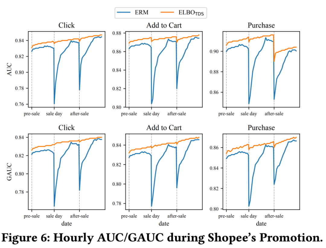 Baseline,即线上的 ERM 方法,在大促前后,即便切换到了小时级别更新,进行快速的分布 adaption,依然在大促前夜、大促后夜的时间区间出现了 auc 断崖下跌,会对大促前几个小时的收入造成损失。而 ELBO_TDS 效果几乎无损。最终,在两周实验期间,ELBO_TDS 取得了 2.33% 的 GMV/user 的收益推全。
