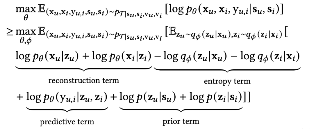 这个目标的含义是,从一个带有噪声 V 的数据分布上采样得到样本,但让模型试图仅仅学习 given 稳定因素 S,X 和 Y 的联合概率分布。上述目标不可直接优化,为了方便 VAE 形式的建模,引入隐变量 Z,稍加推导,可以得到新的目标 ELBO: