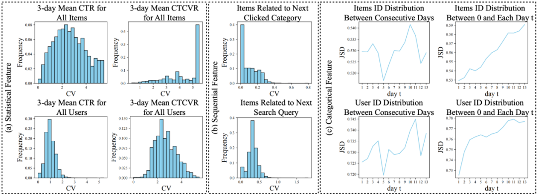 类别特征(例如 item id,user id)的分布,在连续多天的 JSD(香农熵,衡量分布差异性)数值上是缓慢增长。解读:以 item ID 为例,任意相邻两天的 JSD 是 0.53 附近。但第 0 天到第 13 天的累积 JSD 却只增长到了 0.59。