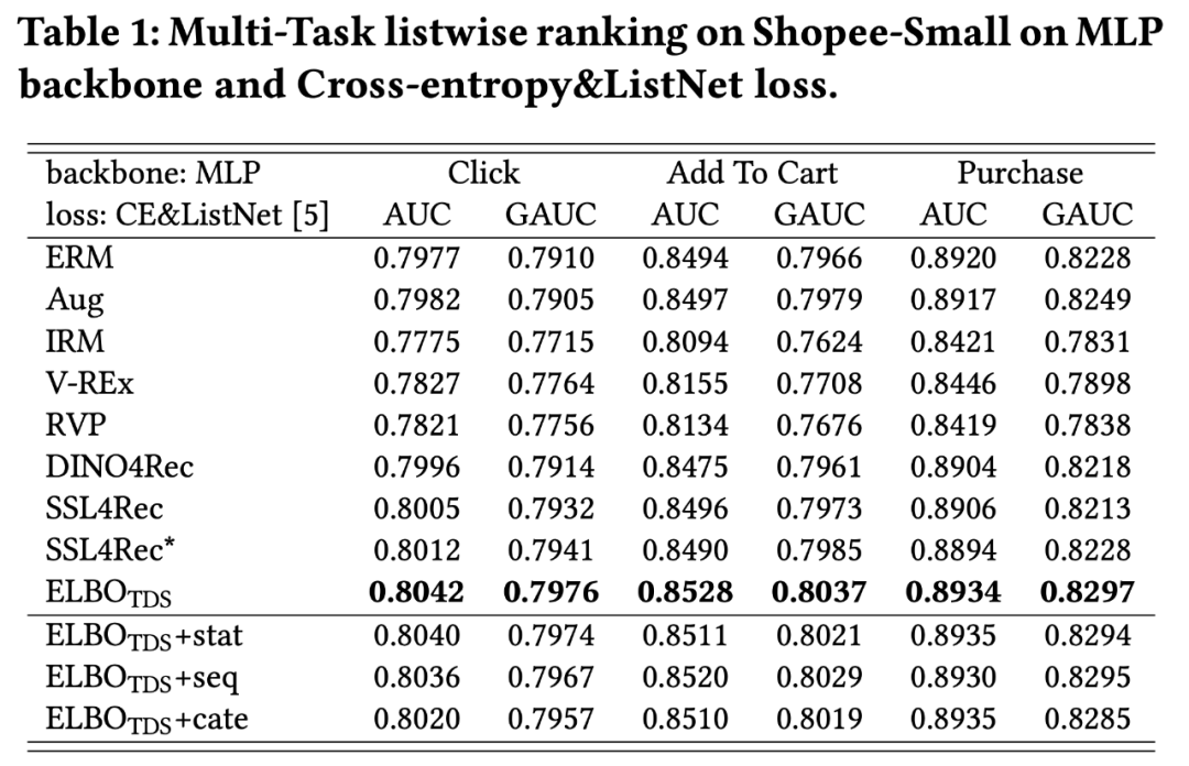 其次,ELBO_TDS 在视频、电商两类模态的数据上均取得有效提升,也说明了 TDS 问题在各类推荐系统中广泛存在。