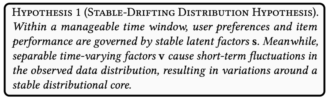 一般情况下,可以假定参与到推荐系统“协同过滤”过程的用户,是“理性”和“感性”掺杂的个体,但多数情况下理性占主导,尤其是电商场景,涉及到真实交易支付。一个商品的质量等本质属性不会突变,所以不会今天畅销、明天滞销、后天又畅销;同样,一个用户,也可以认为其文化背景、生活环境、年龄履历、经济状况,不会经常突变。因此,论文认为,这个稳定的均值代表参与到推荐系统的对象(用户和物品)的“稳定内核”,而横持续跳着的“方差”,则是由各种因素带来的“干扰”,例如社交媒体的流行趋势、热点讯息、用户不定期的访问习惯、广告促销、系统 Bias 和不确定性等等。