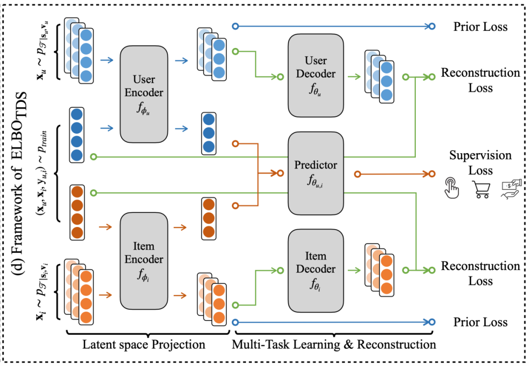 因此,论文方法希望模型能够捕捉到 Z 的分布,从而建模好 X 和 Y 的联合分布。因此,论文方法追究的这个过程,更接近与“生成式建模”的思路(注,不同于目前业界很多所谓的生成式推荐,其本质都还是建模条件分布 P(Y|X),严格意义上属于判别式模型)。