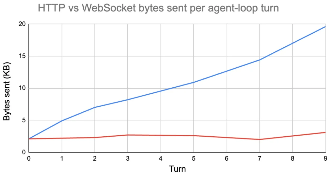 到第 9 轮时,HTTP 每轮发送的数据量几乎是 WebSocket 的 10 倍。原因在于 OpenAI 响应 API 的 WebSocket 模式会维持与服务器的持久连接,并在服务器端使用内存状态。从第一轮之后,后续每一轮只需发送: