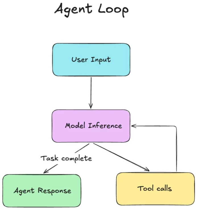 这些智能体的核心是“智能体循环”:即模型推理与工具执行的循环,会不断重复直至任务完成: