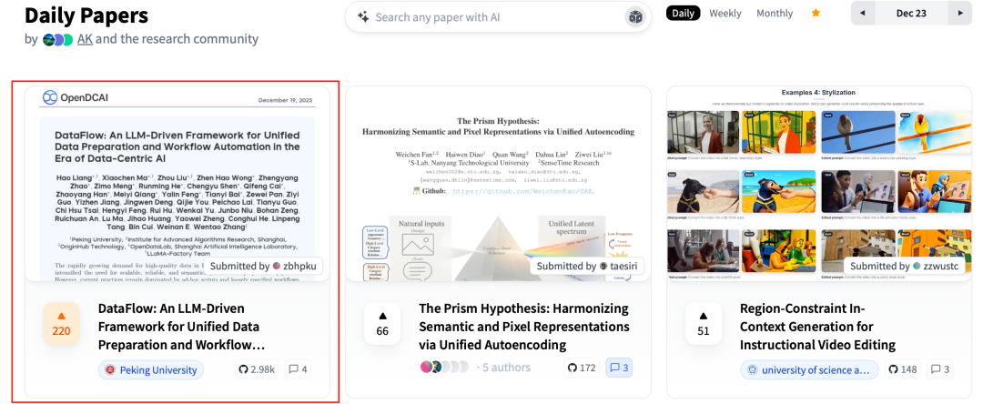 正是基于对这一工程痛点的精准切入,DataFlow 的技术报告在发布后迅速引发了全球开发者的广泛共鸣,并成功登顶 Hugging Face Daily Papers 榜首(#1 of the Day)。这一来自开源社区的强烈反馈印证了一个事实:大模型行业急需一套具备系统化抽象与工业级可靠性的数据治理基础设施。