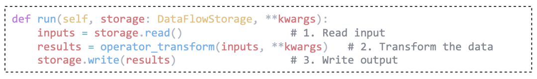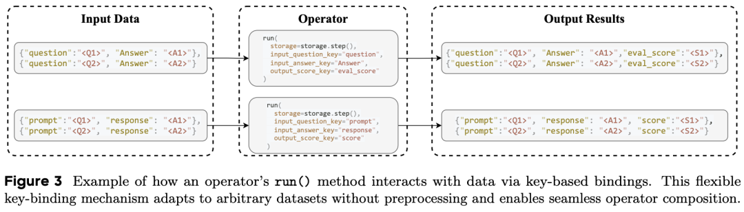 DataFlow 引入了全局表格化存储(Global Storage)抽象。通过统一的 read() 和 write() 接口,将算子逻辑与底层存储格式解耦,每个算子基于统一 run(storage) 接口,通过 键绑定(key-based I/O)灵活适配任意数据格式。无论后端是本地 JSONL、Parquet 还是分布式数据库,算子只需关注字段操作。