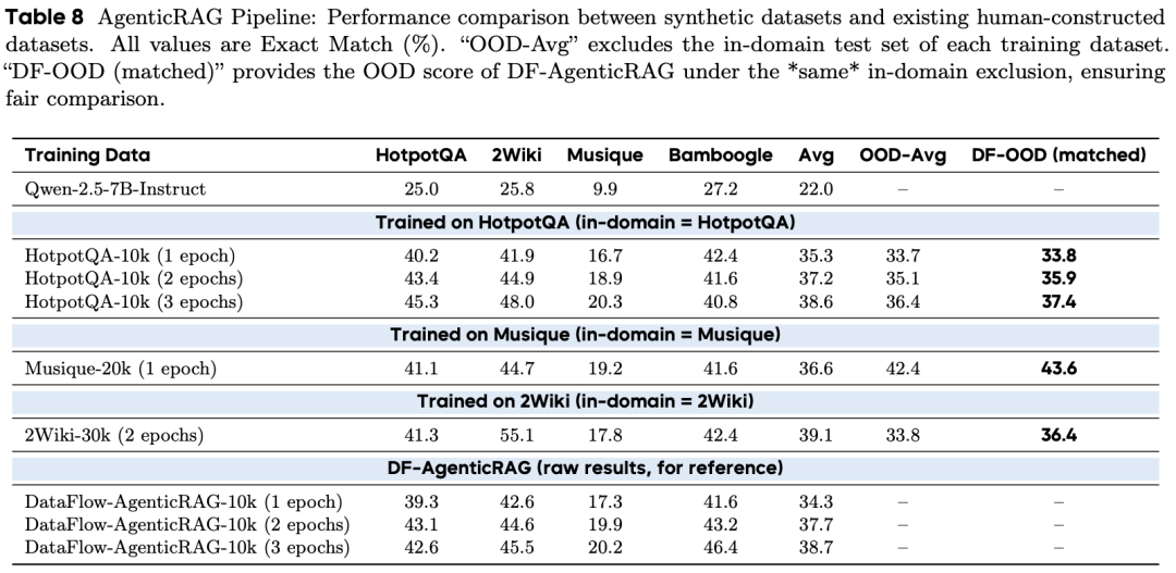 在分布外(OOD)评估中,DataFlow 产出的 DF-AgenticRAG-10k 具备更强的鲁棒性: