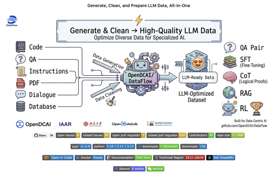 目前,DataFlow 及其自动化 Agent 框架已在 GitHub 开源。我们欢迎社区开发者参与贡献,共同探索数据驱动的无限可能。
