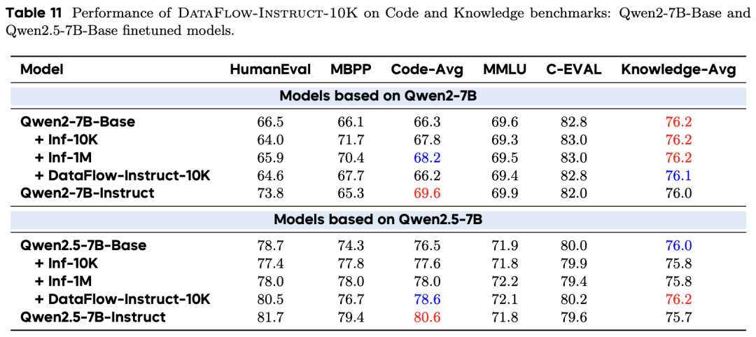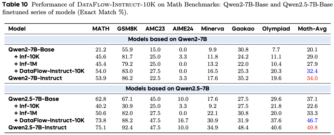 使用仅 10K 的多领域合成样本(DataFlow-Instruct-10K),模型在数学和代码领域的表现已接近官方 Instruct 版本,且通用知识能力(MMLU)未出现退化,证明了高质量合成数据对大规模指令数据的替代潜力。