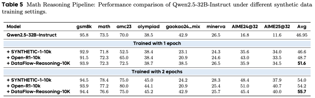 数学推理:使用 DataFlow-Reasoning-10K 微调后,Qwen2.5-32B 在 8 个数学基准上平均得分为 55.7,超越了 Open-R1(54.2)和 Synthetic-1(54.0)。
