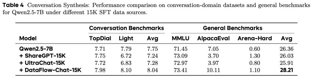 对话合成:DataFlow-Chat-15K 将 AlpacaEval 评分从 7.05 提升至 10.11,超越 ShareGPT 和 UltraChat。