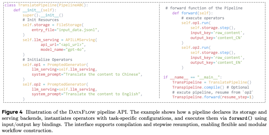 DataFlow 支持将算子组织为有序程序或 DAG。通过 compile() 机制,系统在任务运行前会对字段缺失、类型冲突进行静态检查和。配合延迟执行(Lazy Execution)和断点续传(Checkpoints),极大地提升了大规模分布式任务的可靠性。