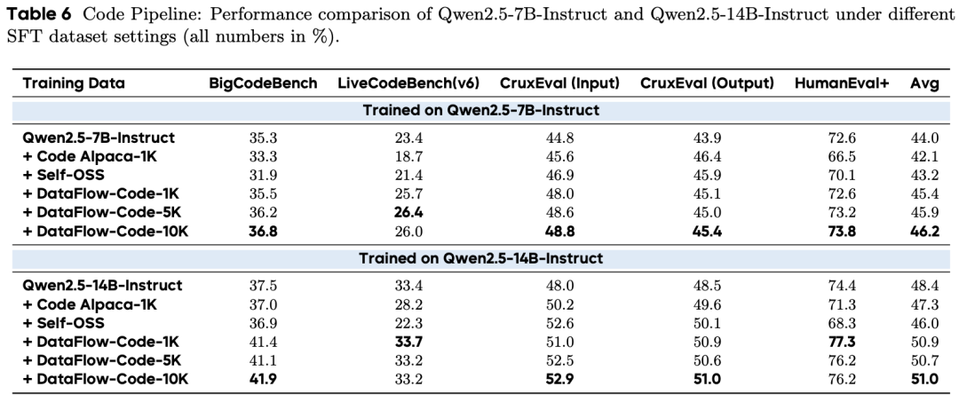 14B 模型:DataFlow-Code-10K 平均得分 51.0,LiveCodeBench 从 21.9(Code Alpaca)提升至 33.2。