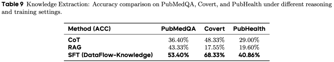 模型在 DataFlow-Knowledge 上 sft 后,PubMedQA 和 Covert 性能提升了 15–20 个百分点,PubHealth 提升 11 个百分点,显著优于传统的 Zero-shot CoT 方案。