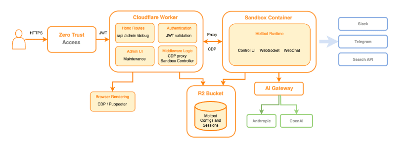 Moltworker 集成了多项 Cloudflare 服务,复刻并扩展了本地版 Moltbot 的体验。AI 请求会经由 Cloudflare AI Gateway 进行路由,支持多模型厂商、集中式可观测性与多种配置选项;浏览器自动化任务通过 Cloudflare Browser Rendering 来处理,使 Moltbot 可以控制无头 Chromium 实例完成页面导航、表单填写与内容抓取,而无需在容器内直接运行浏览器;API 与管理后台的身份认证则通过 Cloudflare Zero Trust Access 实现。